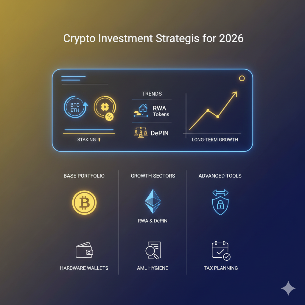 [Image: No text. A clean, professional 3D layout on a yellow background. A digital dashboard shows a diversified portfolio: BTC, ETH, RWA-tokens, and Stablecoins. A shield icon represents security, and a glowing chart shows steady, long-term growth.]