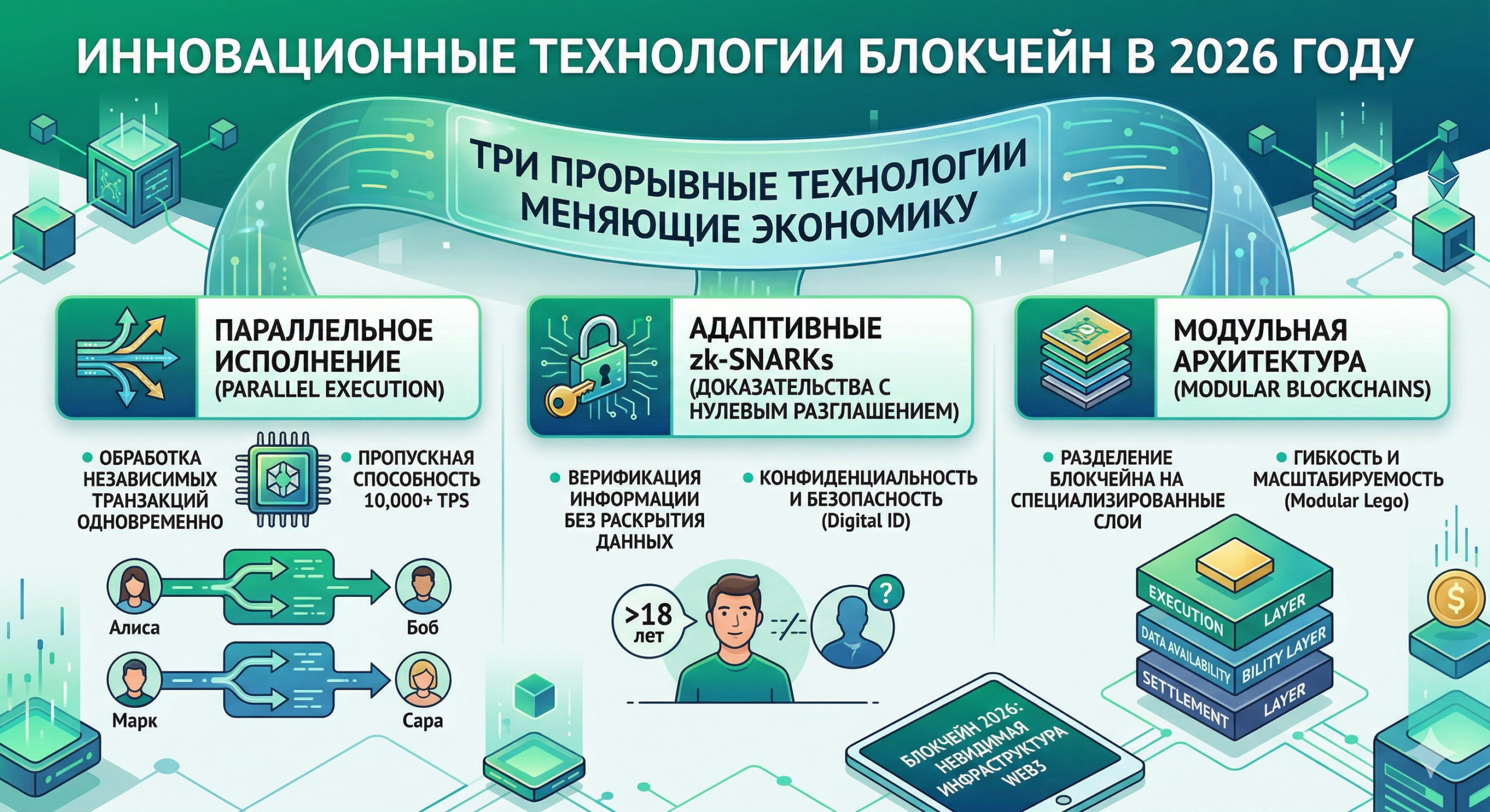 В этой статье мы разберем три прорывные технологии, которые в 2026 году определяют облик индустрии: параллельное исполнение (Parallel Execution), доказательства с нулевым разглашением (zk-SNARKs) и модульные блокчейны.