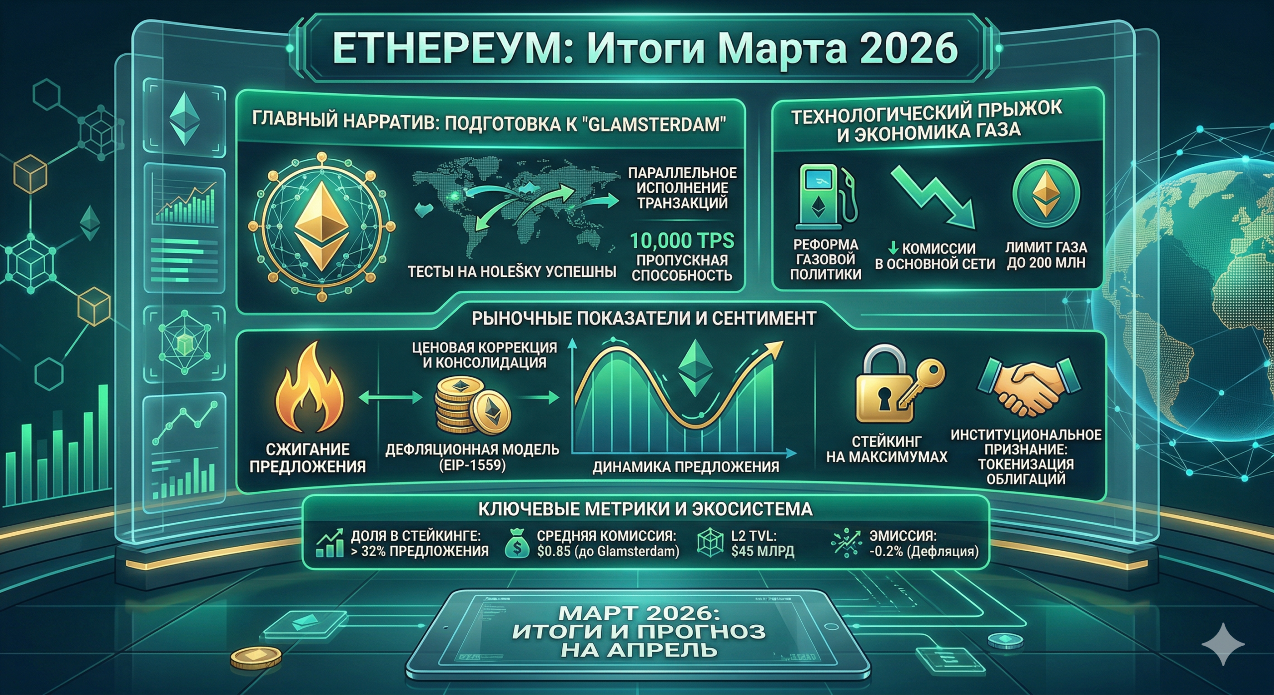 Март 2026 года для Ethereum — это фаза накопления и технической консолидации. Рынок «переварил» мартовскую волатильность, и фокус смещается на фактический запуск Glamsterdam.